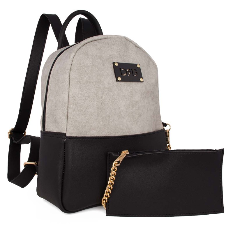 zipper and an outer compartment with a detachable wallet. Adjustable straps. Dimensions: H:34cm L:29cm W:12cm