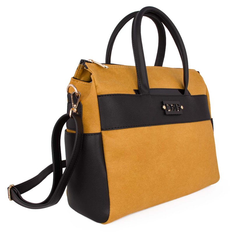 Ochre-colored Shoulder Bag, made from eco-friendly leather with a leather absorbent and breathable lining. It features 2 internal pockets, one with a zipper. Adjustable and removable shoulder strap. Dimensions: H: 26cm, W: 34cm, D: 15cm.