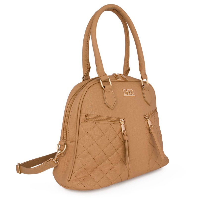 Women's beige shoulder bag. Made of eco-leather. It features 2 inner compartments, one with a zipper, and 3 outer compartments with zippers on the front and back. Adjustable, detachable crossbody strap. Dimensions: H 28cm, W 36cm, D 12cm. "Designed in Greece exclusively by De Raggi designers".