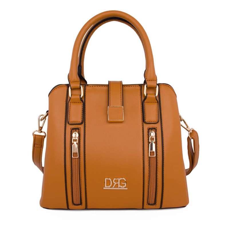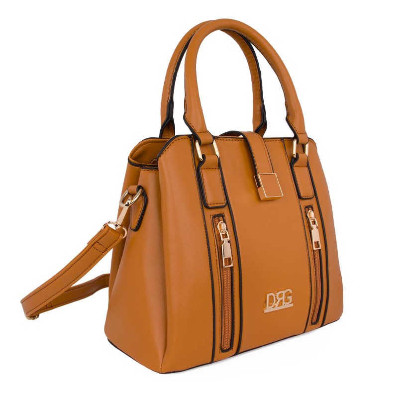 Women's camel shoulder bag. Eco-leather. It has 2 internal compartments, one with a zipper, and 3 external zippered pockets on the front and back. It closes with a metallic clasp and zipper. Adjustable, detachable crossbody strap. Dimensions: H 26cm, W 24cm, D 15cm "Designed in Greece exclusively by De Raggi designers".